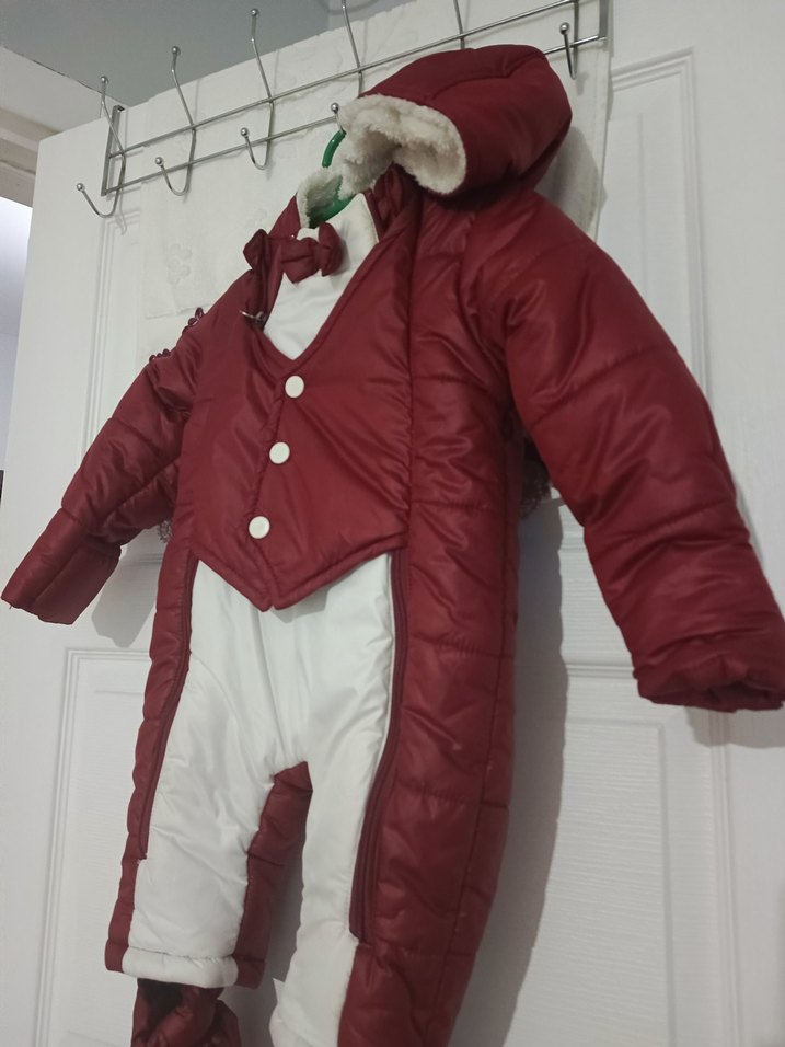Bordo renkli, kürklü detaylara ve yakasında çentikli yaka bulunan bebek kış tulumu. İç kısmı beyazdır, düğmeli ve desensizdir. ❄️
