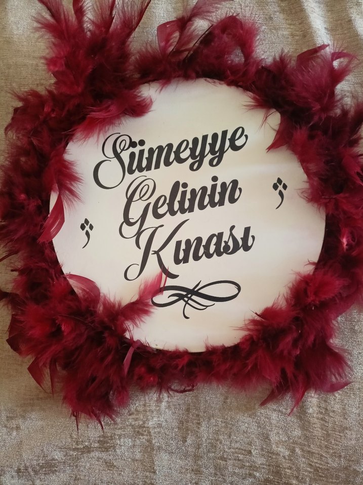 Parlak bordo renkte, kürk detaylı vintage bohem tarzda düğün aksesuarı. Üzerinde 'Sümeyye Gelinin Kınası' yazısı yer alır.