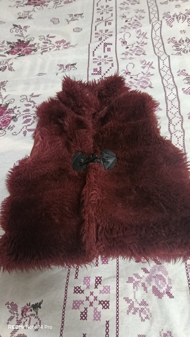 Bordo renk, yumuşak kürk detaylı, kolsuz, bohem tarzda, straplez yakalı ve midi boyda çocuk yeleği. Günlük kullanıma uygun, vücuda oturan kesim.