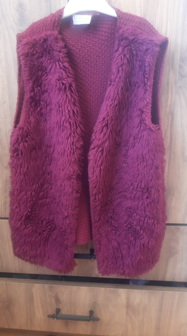 Bordo renk, yün ve kürk detaylı, kolsuz, normal boyda kadın yeleği. Notch yaka ve bol kesim bohem tarzı için uygun.kusursuz .çok az kullanıldı