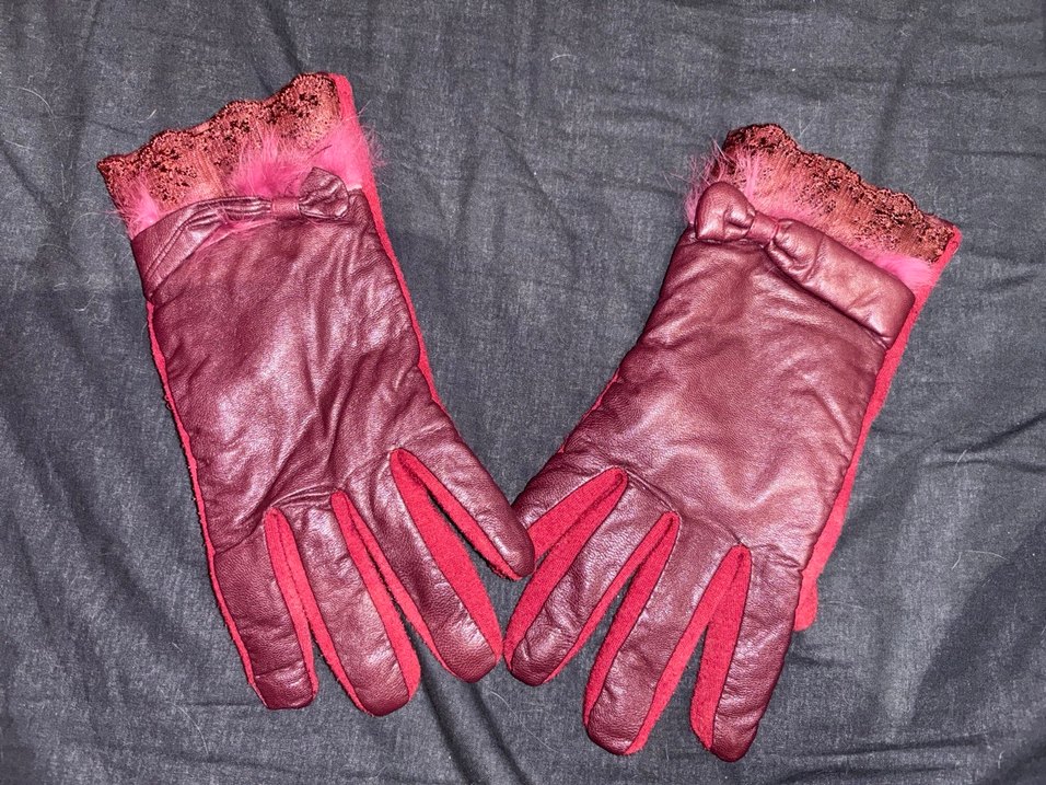Bordo renkli deri kadın eldivenler, manşetlerinde kürk detaylarıyla vintage ve şık bir görünüm sunar.