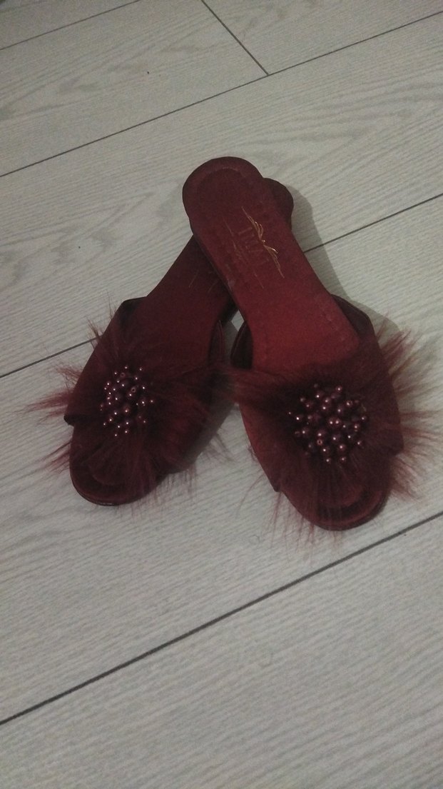 Bordo Kürklü İşlemeli Kadın Topuklu Terlik