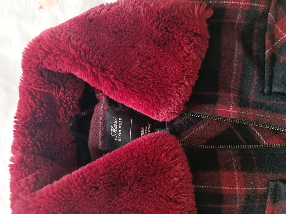 Bordo desenli, yumuşak fleece kumaştan yapılmış, kürklü detaylı ve strappy kollu, normal boyda, gençler için uygun, dar kesim kadın kışlık ceket.