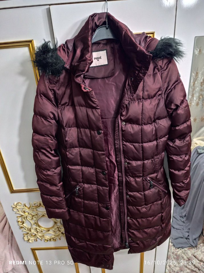 Bordo renkte, kapüşonunda kürk detaylı, belden oturan, midi boy sokak tarzı kadın kışlık mont. Yumuşak sentetik kumaştan, notlu yaka ve askılı kollara sahip.