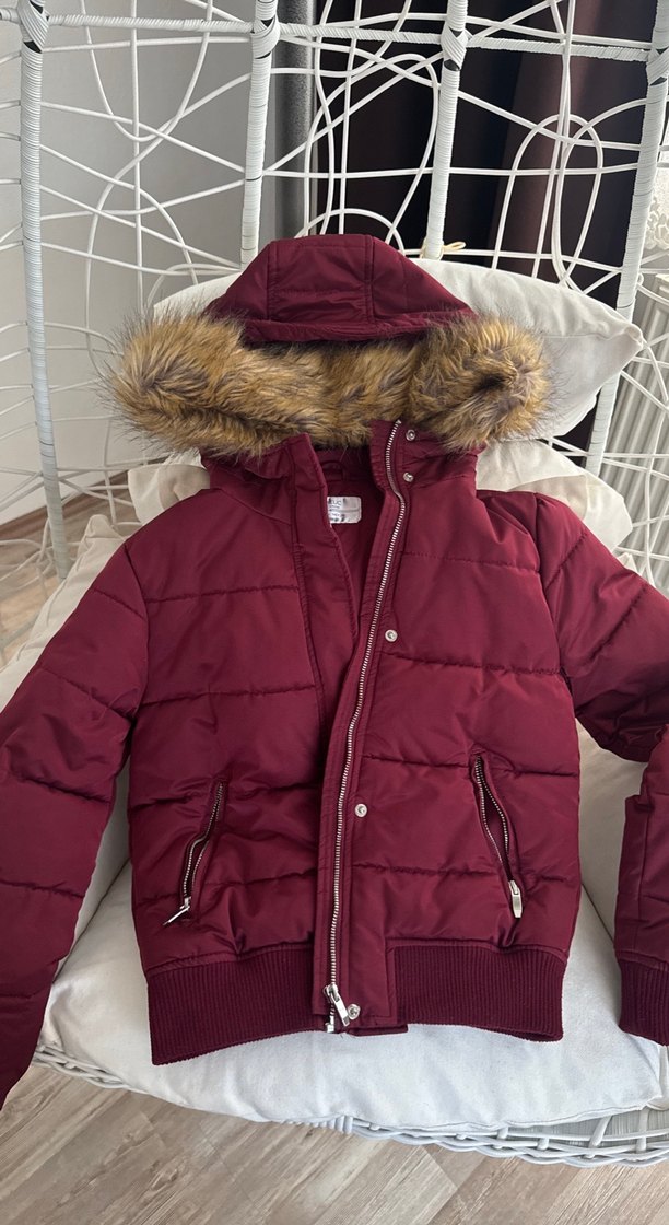 Bordo renk, kürklü kapüşonlu, uzun kollu, fitted kesim ve notched lapel yaka detaylı kadın kışlık mont. Yumuşak ve sıcak dokusuyla günlük kullanıma uygun.