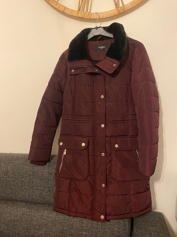 Bordo renkli, kürklü yaka detaylı, midi boy, uzun kollu kadın kışlık mont. Rahat kesimi ve yumuşak kumaşıyla günlük kullanım için uygundur. ❄️