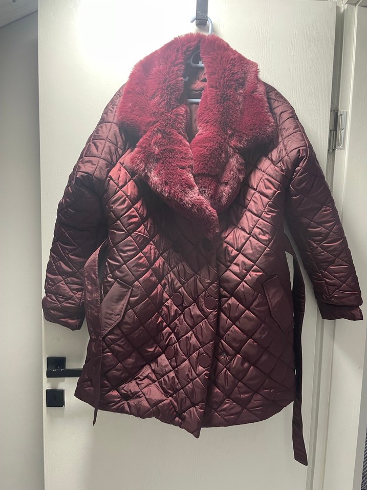 Bordo renkli, kürklü yakalı ve fitted kesim kadın kışlık mont. Rahat ve sıcak fleece astar, kapitone deseniyle günlük kullanıma uygun.