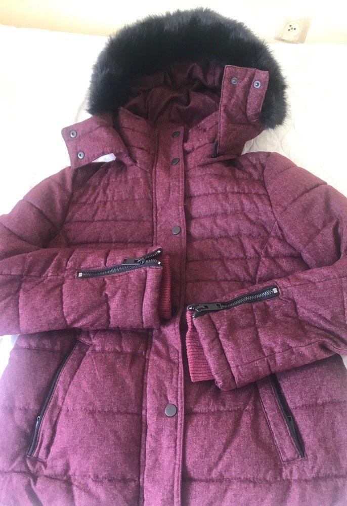 Bordo renkli, kürklü kapüşonlu, yumuşak ve sıcak kumaşlı, normal midi boyda, kesimli kadın kışlık mont. Rahat ve trend sokak stili için uygundur. ❄️