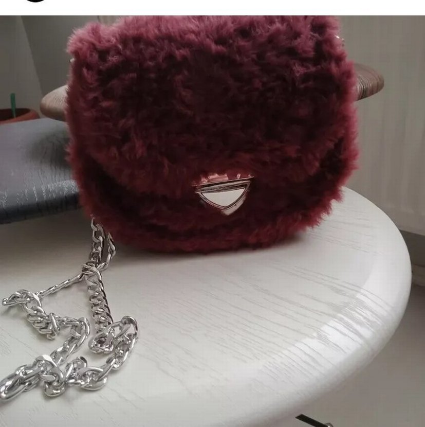 Bordo renkli, kürklü detaylı ve nakışlı kadın omuz çantası. Parlak gümüş zincir askısı ile günlük kullanıma uygundur.