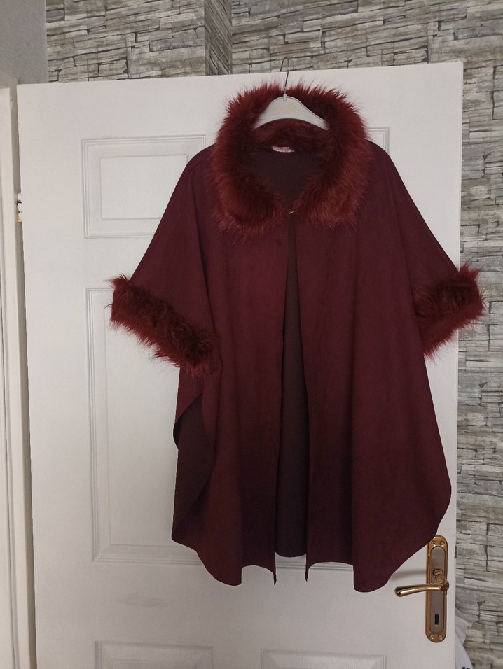 Bordo renkli kadın panço, yaka ve kol detaylarında kürk süslemeye sahip. Notched lapel yaka, uzun kollu, bol kesim ve midi boyda, yumuşak ve sıcak kumaştan üretilmiştir.