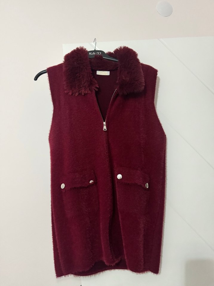 Bordo renkli, kürklü detaylı, yakalı ve kolsuz kadın yelek. Esnek standart beden
