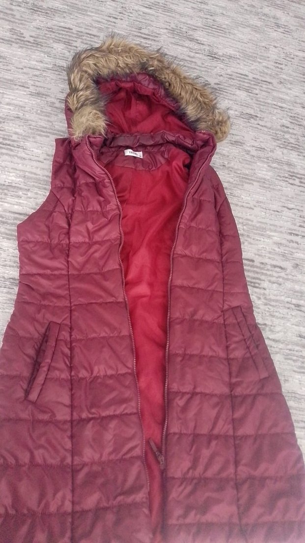 Bordo renk, kürklü kapüşonlu, kolsuz ve vücuda oturan kadın yeleği. Yumuşak sentetik kumaştan, günlük sokak stiline uygun.