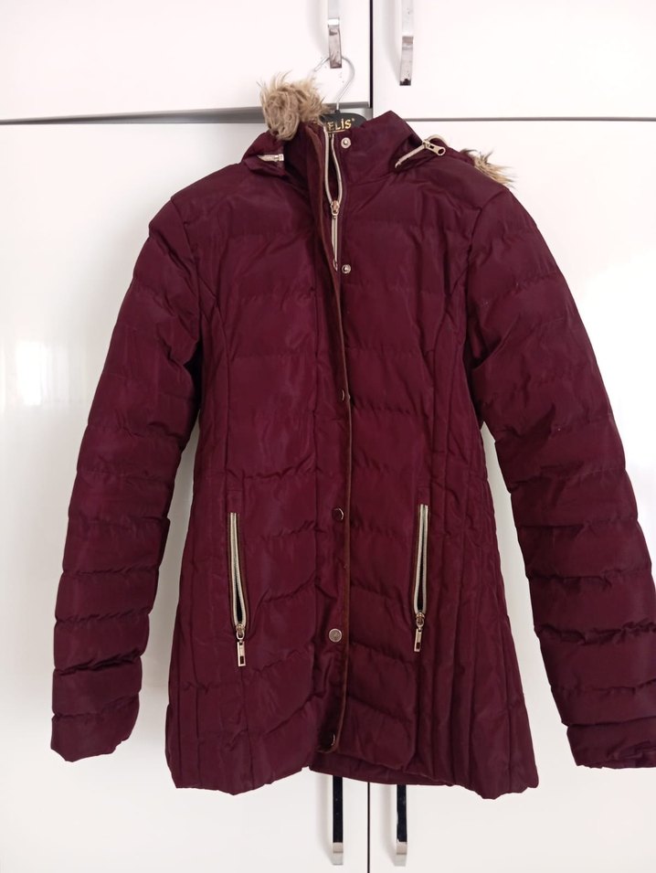 Bordo renkli, kapüşonunda kürk detaylı, normal boyda ve dar kesim kız çocuk kışlık mont. Sentetik kumaş ve fermuarlı ceplere sahip, rahat sokak stili için uygundur. Kalın ve sorunsuzdur iç kısmında küçük sökük vardı diktim belli değil başka sorunu yok ❄️