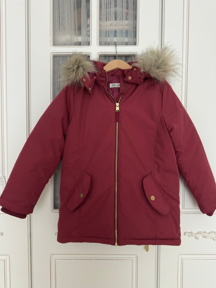 Bordo renk, parlak görünümlü kız çocuk montu, kürklü kapüşon ve kesik yaka detayı ile sokak tarzına uygun, yumuşak ve sıcak kumaştan yapılmıştır. Lekesiz,temizdir. Astarı sağlam. Sıfır ayarında.