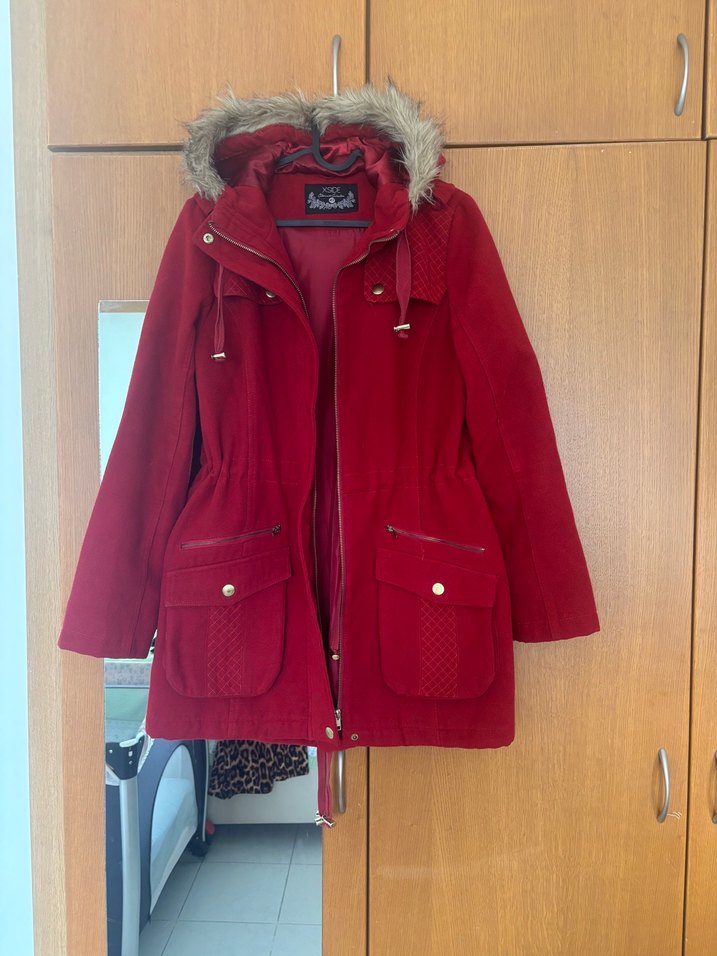 Bordo renk, kürklü kapüşonlu, uzun kollu, normal boy midi kadın ceket. Yumuşak ve sıcak kumaştan, sokak stiline uygun, rahat kesim. Ürün 40 bedenle uyumludur. Defosu yoktur.