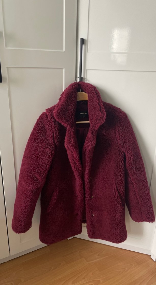 Bordo, kürklü detaylı, midi uzunlukta, yumuşak ve sıcak dokulu kaban. Notch yakalı, uzun kollu ve bol kesim, günlük kullanıma uygun. Çok güzel sıcak tutan bir kaban sadece çok montum olduğu için satıyorum. Hiçbir sorunu yoktur.Xs-S beden rahatlıkla giyer.
