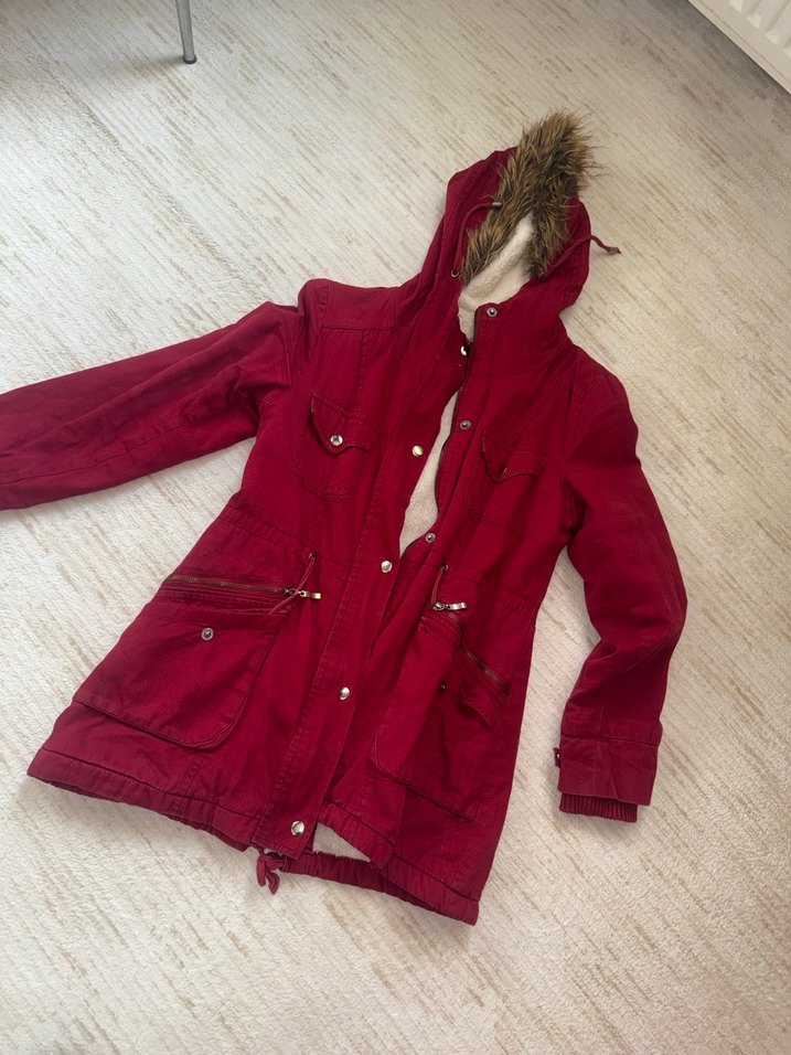 Bordo renkli, kürklü kapüşonlu, bol kesim midi kadın ceket. Uzun kollu, parlak görünümlü, yumuşak ve sıcak kumaştan üretilmiştir.