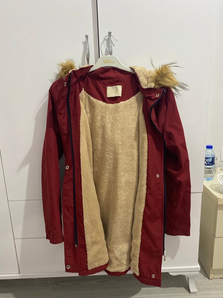 Bordo renkli, uzun kollu, straplez yaka ve kürklü kapüşon detaylı, rahat kesim midi kadın mont. İç kısmı yumuşak ve sıcak tutan kumaşla kaplıdır.