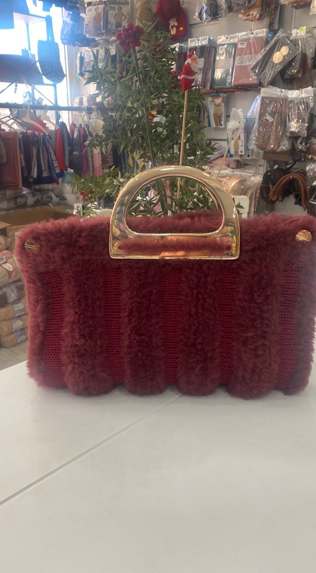 Bordo renkli, parlak dokulu örgü çanta, kürk detayları ve altın renkli sapıyla günlük kullanıma uygun bohem tarzda bir tasarım.