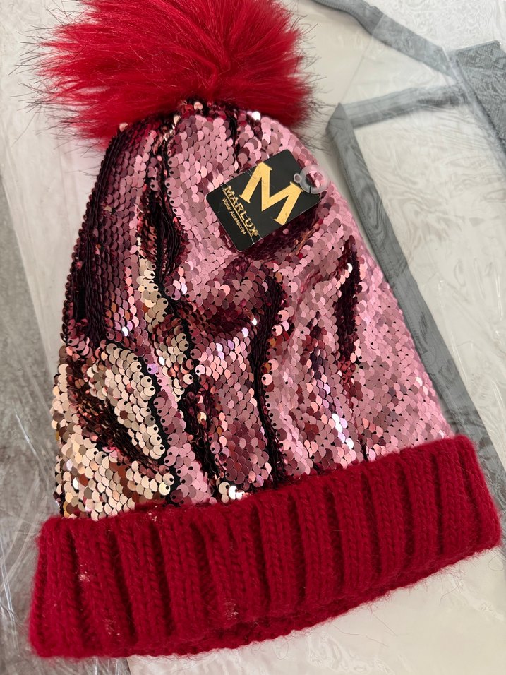 Kadın bere, renkli payetler ve bordo örme manşet ile, yumuşak kürk detaylı ponponu bir araya getirerek rahat ve sokak stilini sunar.