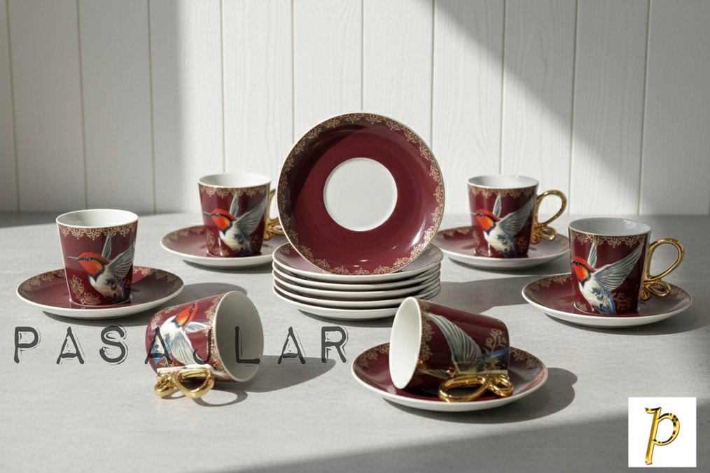 Altın detaylı, kuş desenli bordo renkli 6'lı fincan ve tabak seti. Sofranıza klasik bir hava katar.