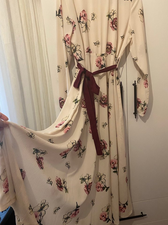 Çiçek desenli, yüksek yakalı ve askılı kollarıyla uzun, bol kesim bohem elbise. Bordo kuşaklı drapeli tasarım romantik dokunuş katıyor.