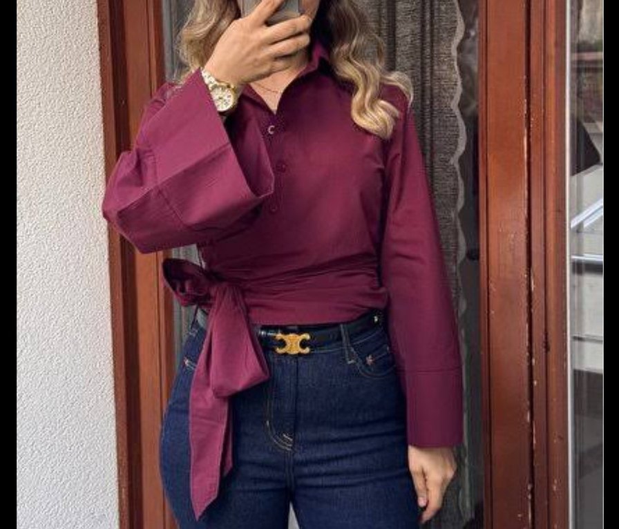 Bordo renkte, uzun kollu, kuşaklı ve halter yakalı kadın gömleği. Denim kumaştan, parlak görünümlü, rahat kesimle günlük kullanıma uygundur.