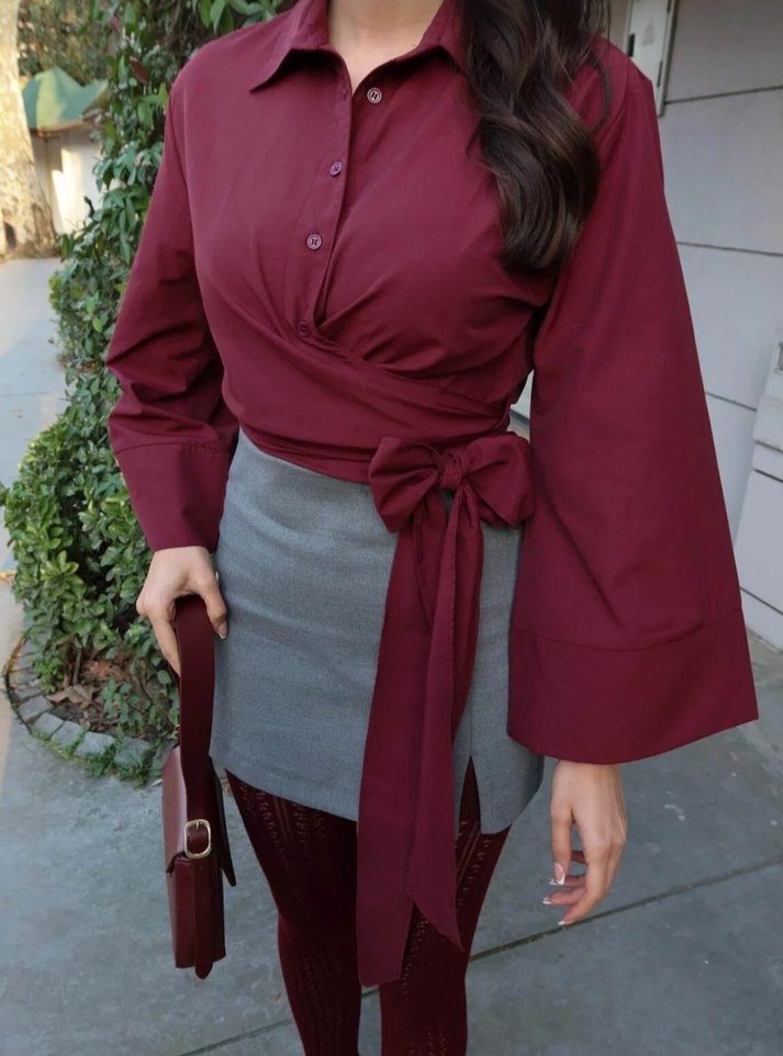 Bordo renkte, yakalı ve kuşaklı uzun kollu bluz, gri midi etekle kombinlenmiş. Sentetik kumaştan, ofis için uygun ve vücuda oturan kesim.