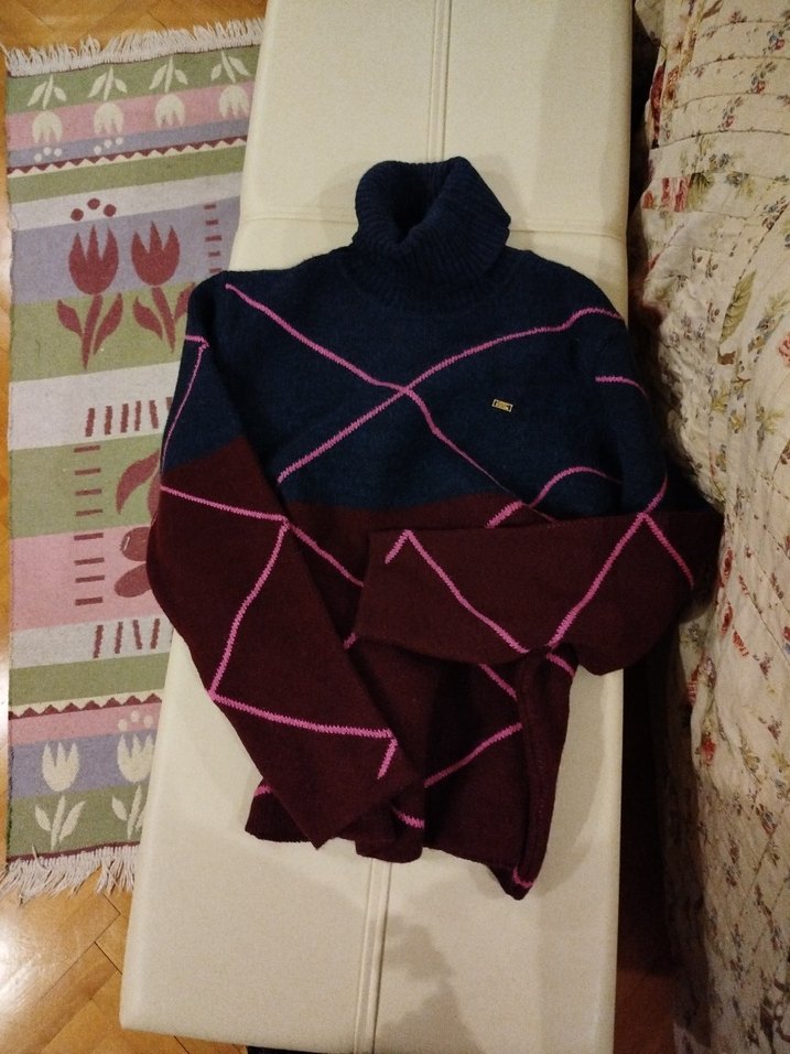 Kadınlar için balıkçı yaka, bol kesim, bordo ve lacivert renk bloklu pembe çizgili, uzun kollu, orta uzunlukta midi triko kazak. polo marka hiç kullanılmadı