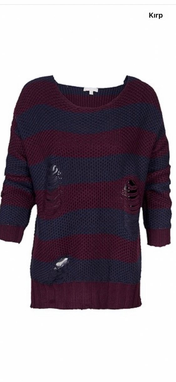 Bordo ve lacivert çizgili, yuvarlak yakalı, uzun kollu, bol kesim kadın triko kazak. Rahat ve günlük stil için uygun, yırtık detaylara sahip.