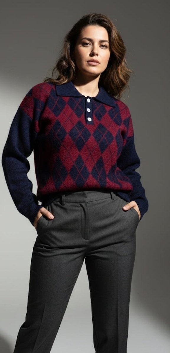 Bordo ve lacivert renklerde, örgü dokulu, uzun kollu, yakalı ve bol kesim kadın kazak. Günlük ve sokak stiline uygun, rahat bir parçadır.