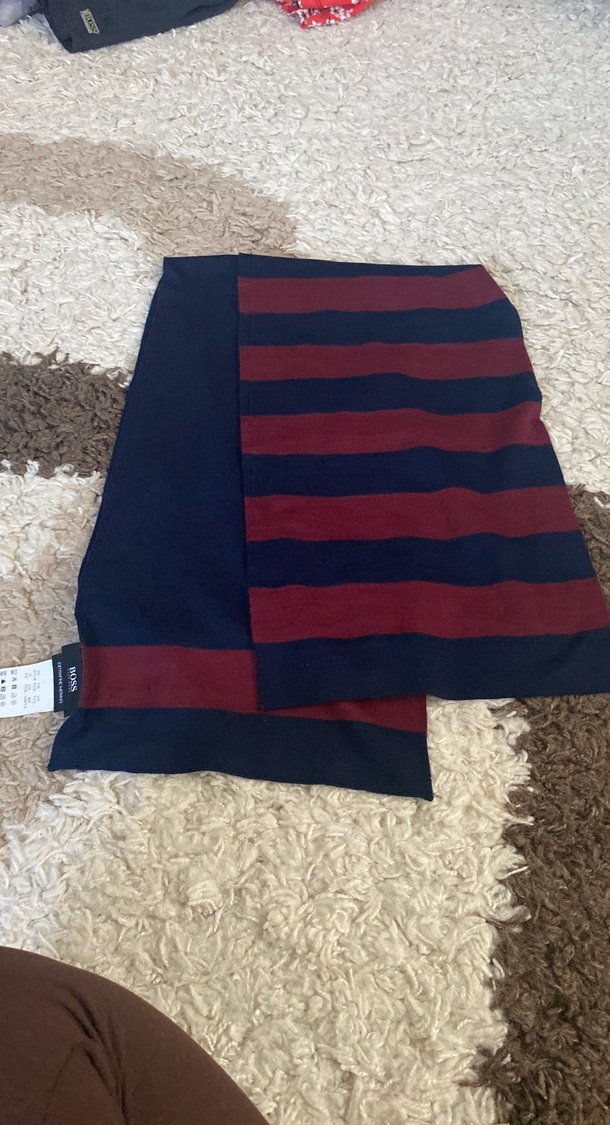 Bordo ve lacivert renklerde çizgili erkek midi atkı. Normal uzunlukta, yumuşak ve rahat dokulu, sokak tarzına uygun.ufak bi hatası var