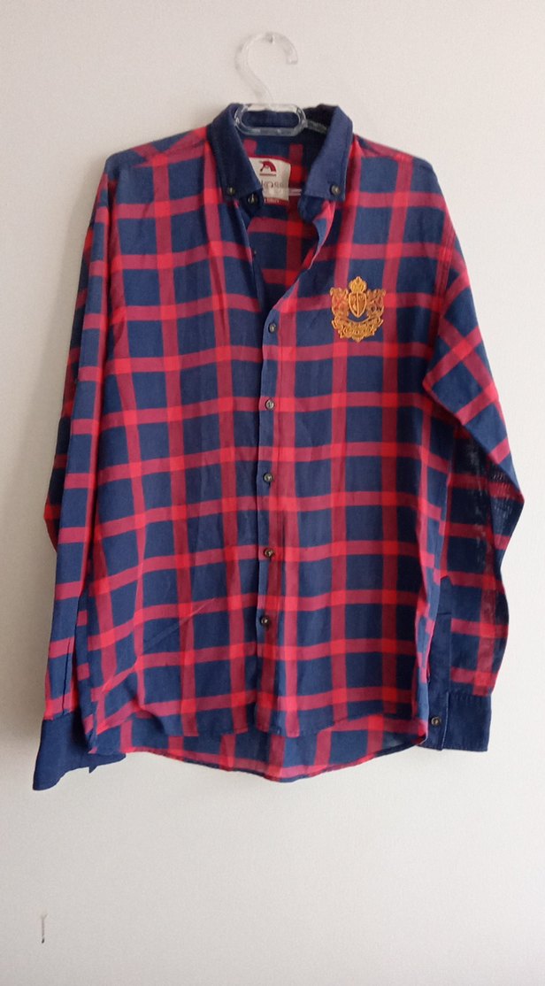 Bordo ve lacivert kareli desenli, düğmeli, uzun kollu, notched lapel yaka erkek gömleği. Rahat kesimi ve göğüs kısmındaki nakış detay ile günlük kullanım için uygundur. en 50 boy 74