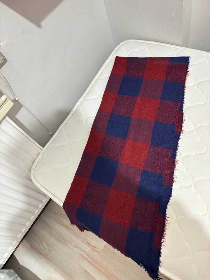 Örgü yapıda, bordo ve lacivert kareli desene sahip, yumuşak sentetik kumaştan bohem tarza uygun kadın atkısı.