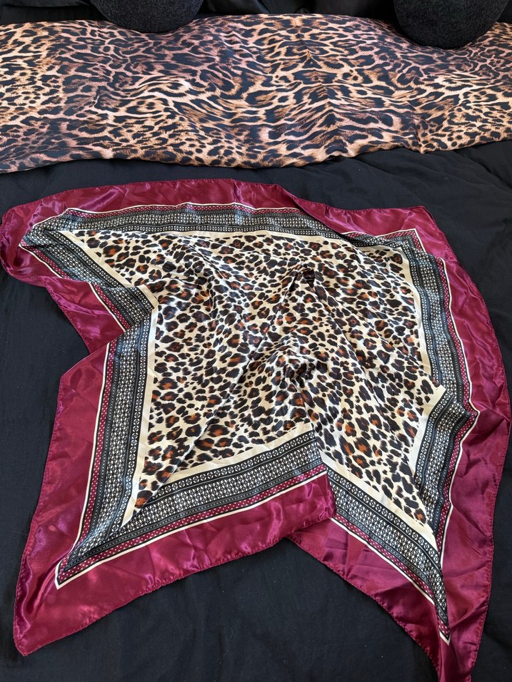 Bordo kenarlı ve leopar desenli, yumuşak sentetik kumaştan yapılmış bohem tarzda kadın fular. Drapeli tasarıma sahiptir.