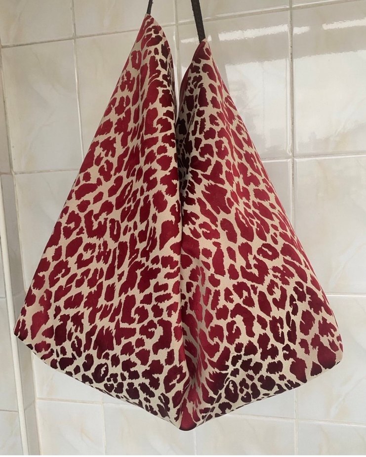 Çift taraflı kullanılır Bordo renkte, parlak sentetik +deri kumaştan yapılmış, leopar desenli ve drapeli kadın çantası. Günlük kullanıma uygun, bohem tarzda.