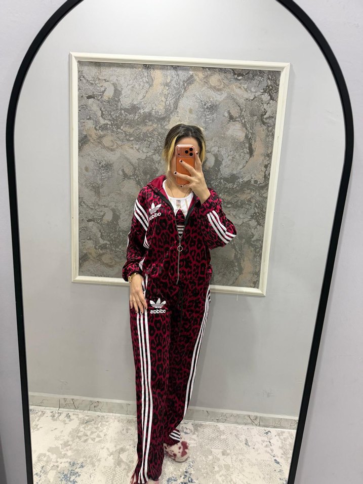 Bordo renkli, leopar desenli kadın eşofman takımıdır. Bol kesim, normal midi boy, uzun kollu ve kapüşonludur. Kürk detayları ve yumuşak kumaşıyla gündelik rahatlığa uygundur.
