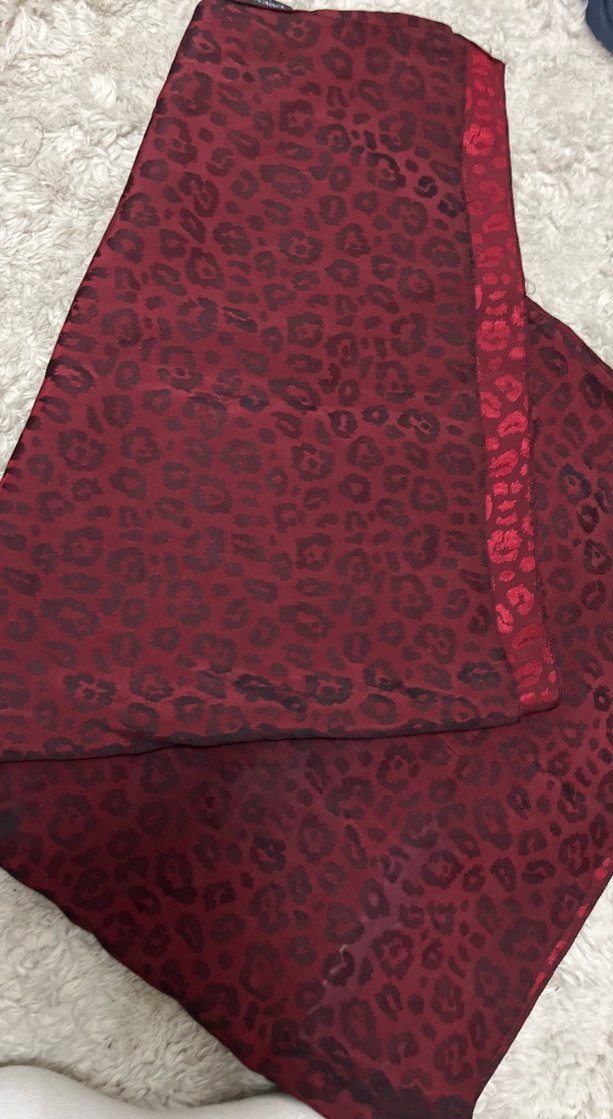 Bordo renkli, yumuşak sentetik kumaştan yapılmış, leopar desenli ve drapeli kadın şalı, bohem tarzı yansıtıyor.