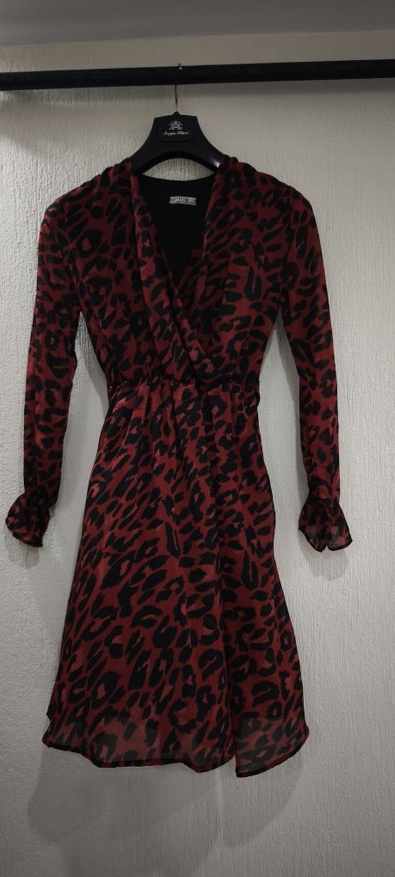 Bordo leopar desenli, V yakalı uzun kol şifon elbise Rahat kesimli ve kısa boylu, yumuşak sentetik kumaştan üretilmiştir.