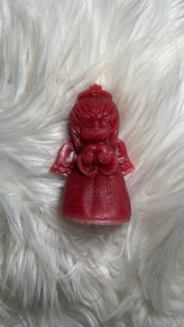 Bordo renkte, kanatları ve duruşu detaylı melek figürlü mum, dekoratif kullanım için uygundur. ️