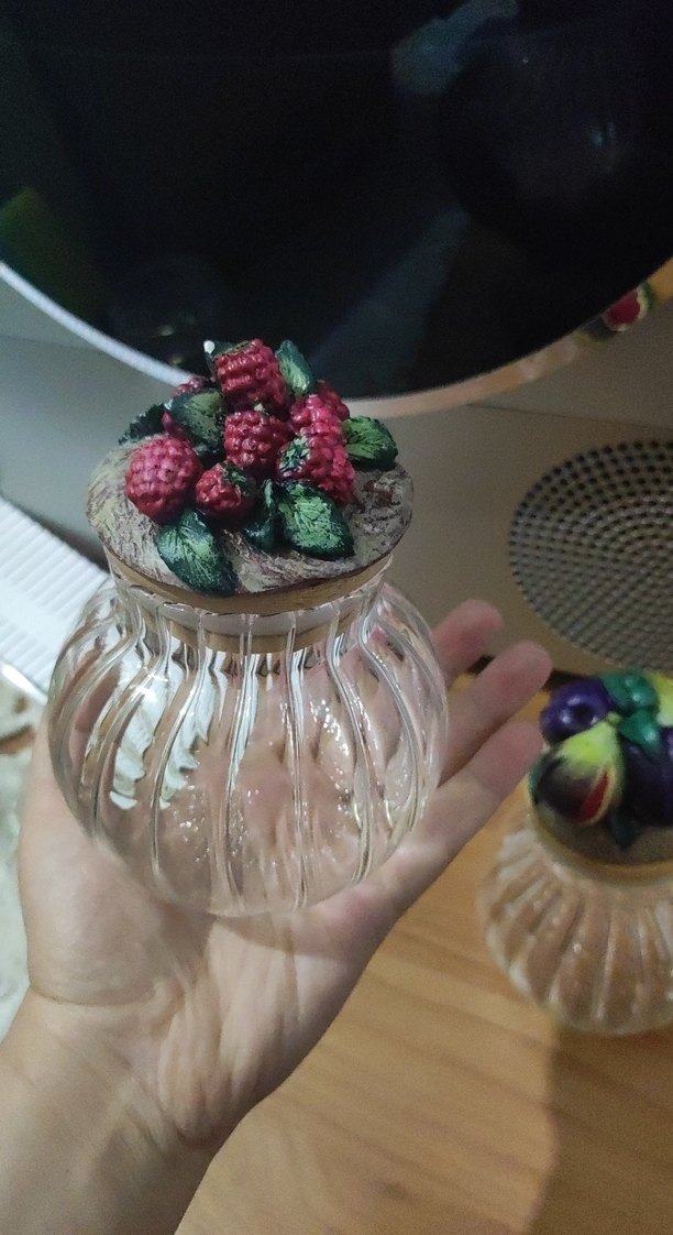 Bu küçük şeffaf cam vazo, kabartmalı tasarıma ve bordo meyve ile yeşil yaprak detaylı mantar kapağa sahiptir.
