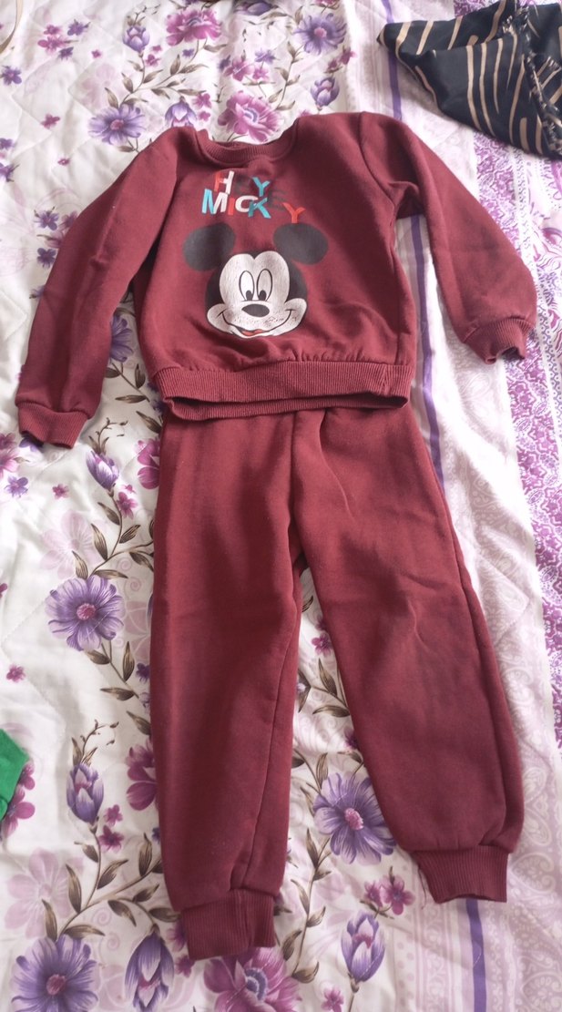 Bordo renkli, rahat kesimli, uzun kollu ve bisiklet yaka kız eşofmanı. Üst kısmında Mickey Mouse baskısı bulunan, triko dokulu ve sıcak tutan kumaştan yapılmıştır. 3 4 yaş