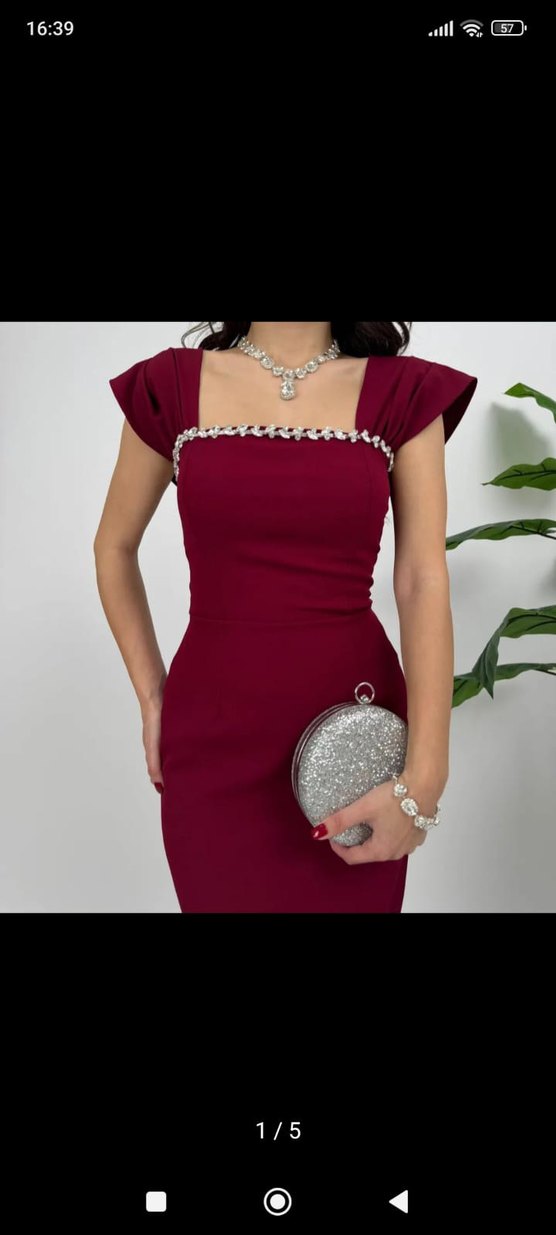 Bordo renk, mini uzunlukta, modern klasik kesim abiye elbise. İncili detaylı, işlemeli ve payetli, kayık yaka ve ince askılıdır. ✨2 saatliğine giyildi yenidir m l bedene uygundur