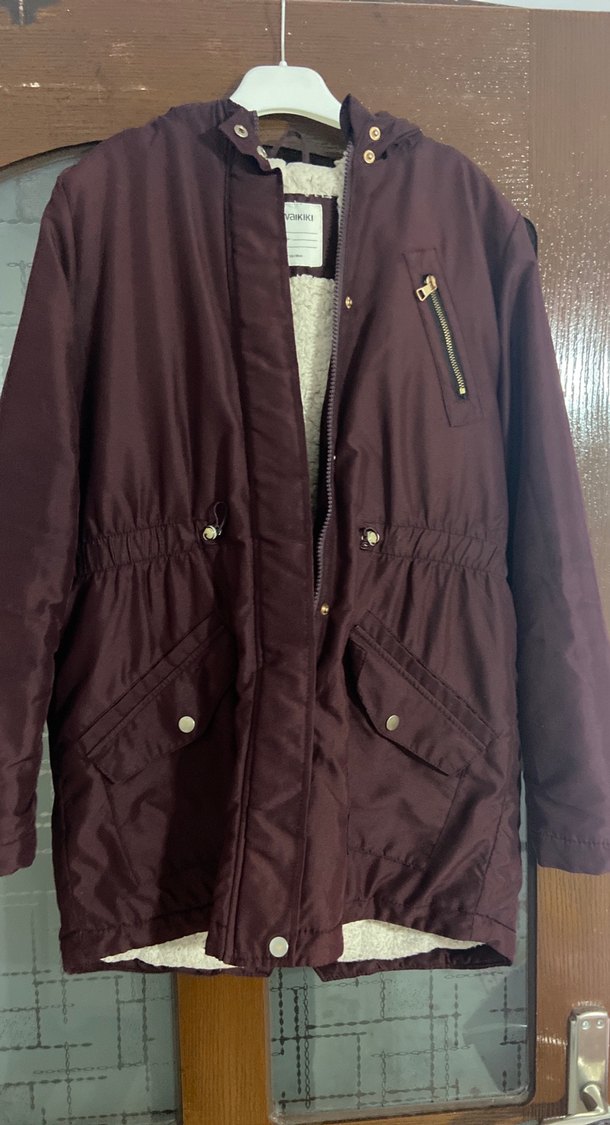Bordo midi uzunlukta kadın ceket, yakasında kesik detay ve düğmeli kapama bulunur. Rahat kesim, uzun kollu ve yumuşak astarlı, günlük rahat sokak stili için uygundur.