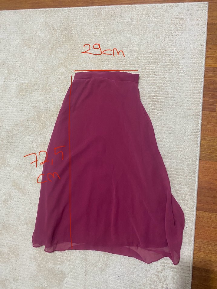 Bordo renkte, drapeli ve bol kesime sahip midi uzunlukta kadın eteği. Yumuşak sentetik kumaştan üretilmiş, 29cm bel genişliği ve 72,5cm boy uzunluğu ölçülerindedir. Minimalist bohem tarzına uygun, açık hava kullanımı için ideal.