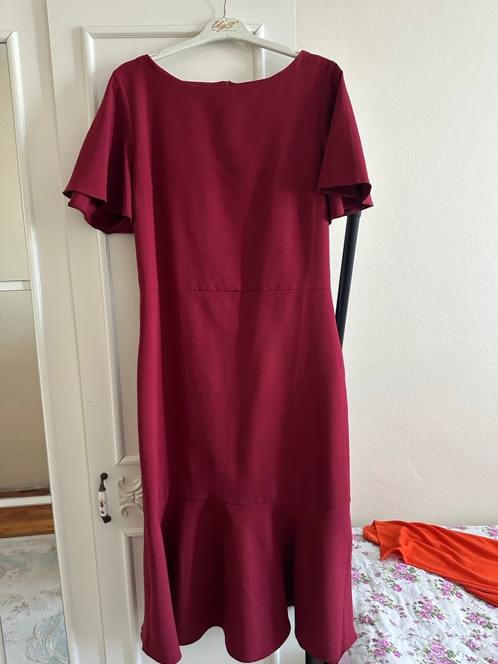 Bordo renk, v yaka, kısa kollu, drapeli ve vücuda oturan midi elbise. Minimalist tarzda, ofis için uygun.