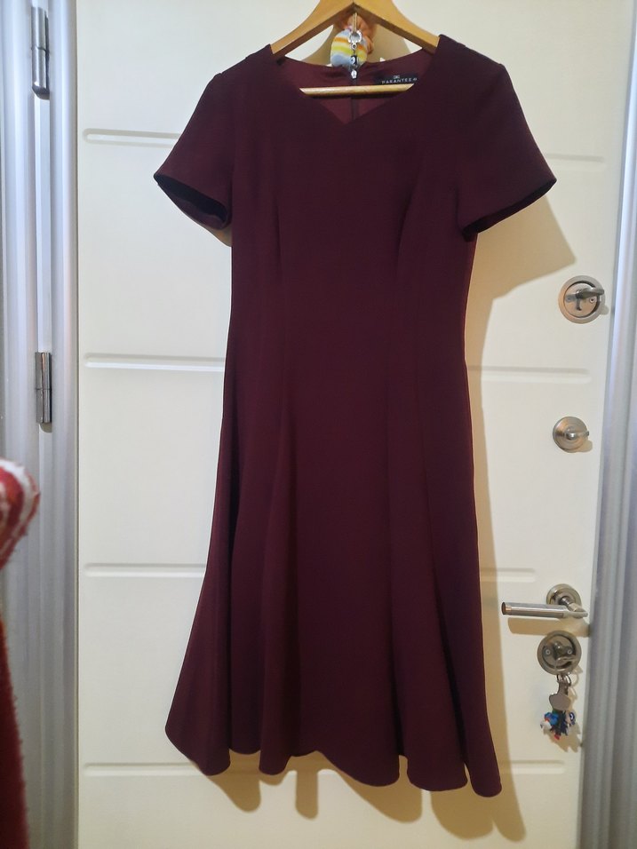 Bordo midi elbise, drapeli tasarım, V yaka ve kısa kollu, klasik zarafetle modern stili birleştirir, ofis kullanımı için uygundur. iki koltuk arasi 46 cm. boy 102 cm.