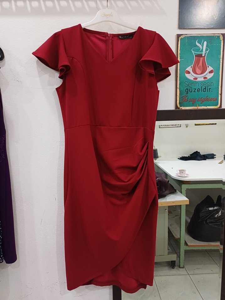 Bordo midi elbise, V yaka ve kısa kollu olup, drapeli tasarımıyla modern bir görünüm sunar. Cesur ve minimalist ofis tarzına uygundur.