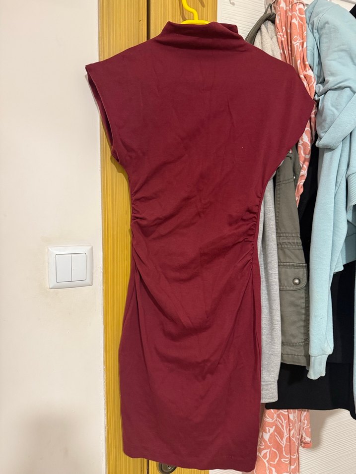 Bordo renk, yüksek yakalı, kolsuz, midi boy ve drapeli hamile elbisesi. Günlük kullanıma uygun, düz ve ince dokulu kumaştan yapılmıştır. Geçen sene yılbaşı için almıştım sadece o gün giyildi.