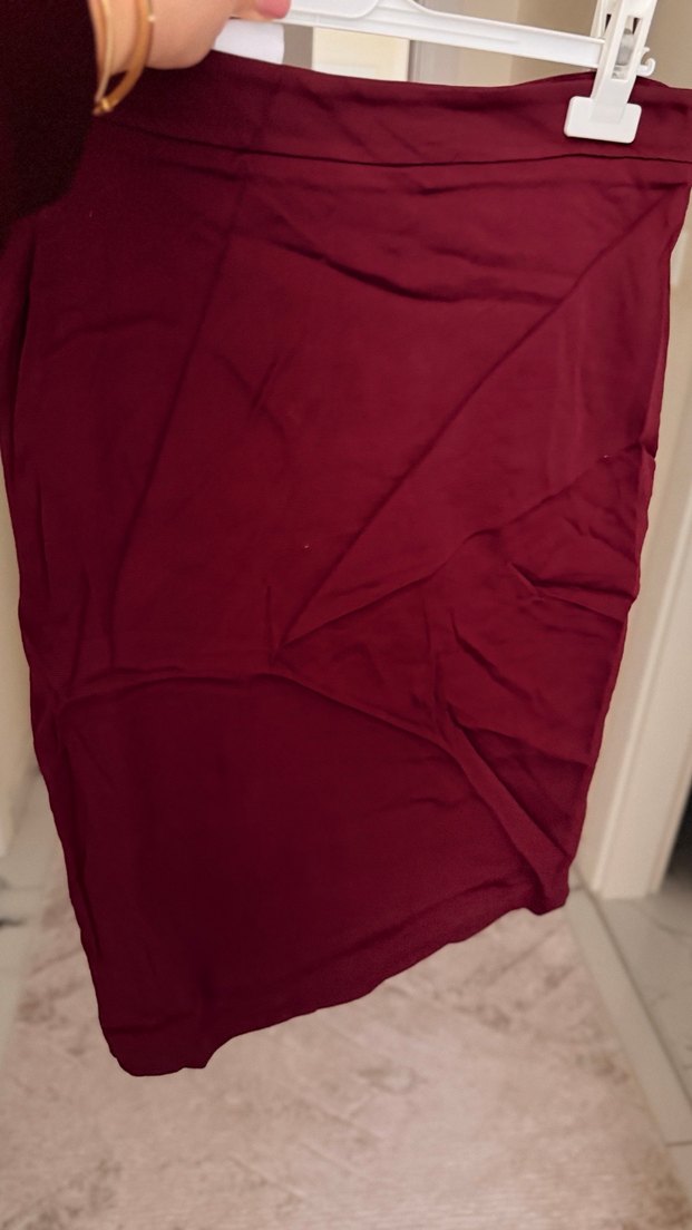 Bordo renkte, ve midi boyda, vücuda oturan eteği. Düz ve yumuşak sentetik kumaştan, minimal ve bohem tarzda, romantik akşamlar için uygun. Hiç kullanılmadı. Hafif parlak saran bi kumaşı var